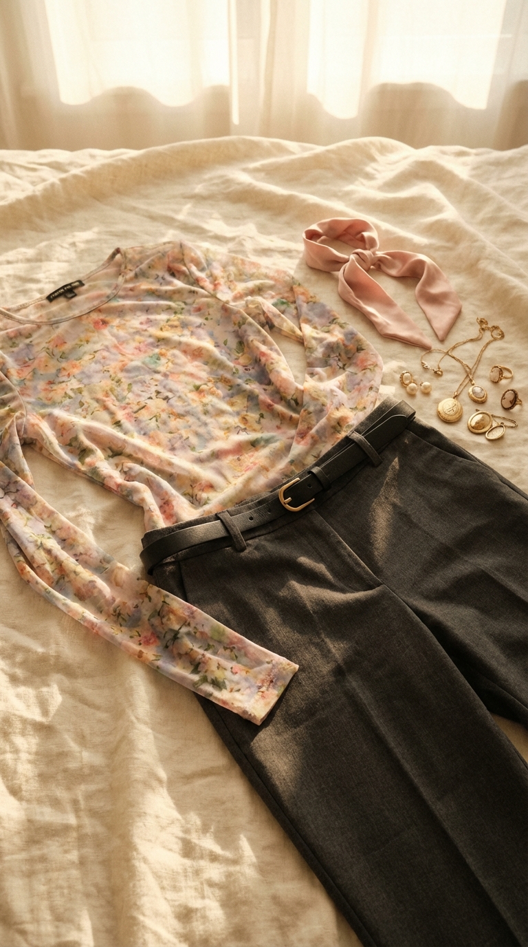 Gilded Mesh & Grace: Printed Mesh Tops & Grey Trousers | HeartIn