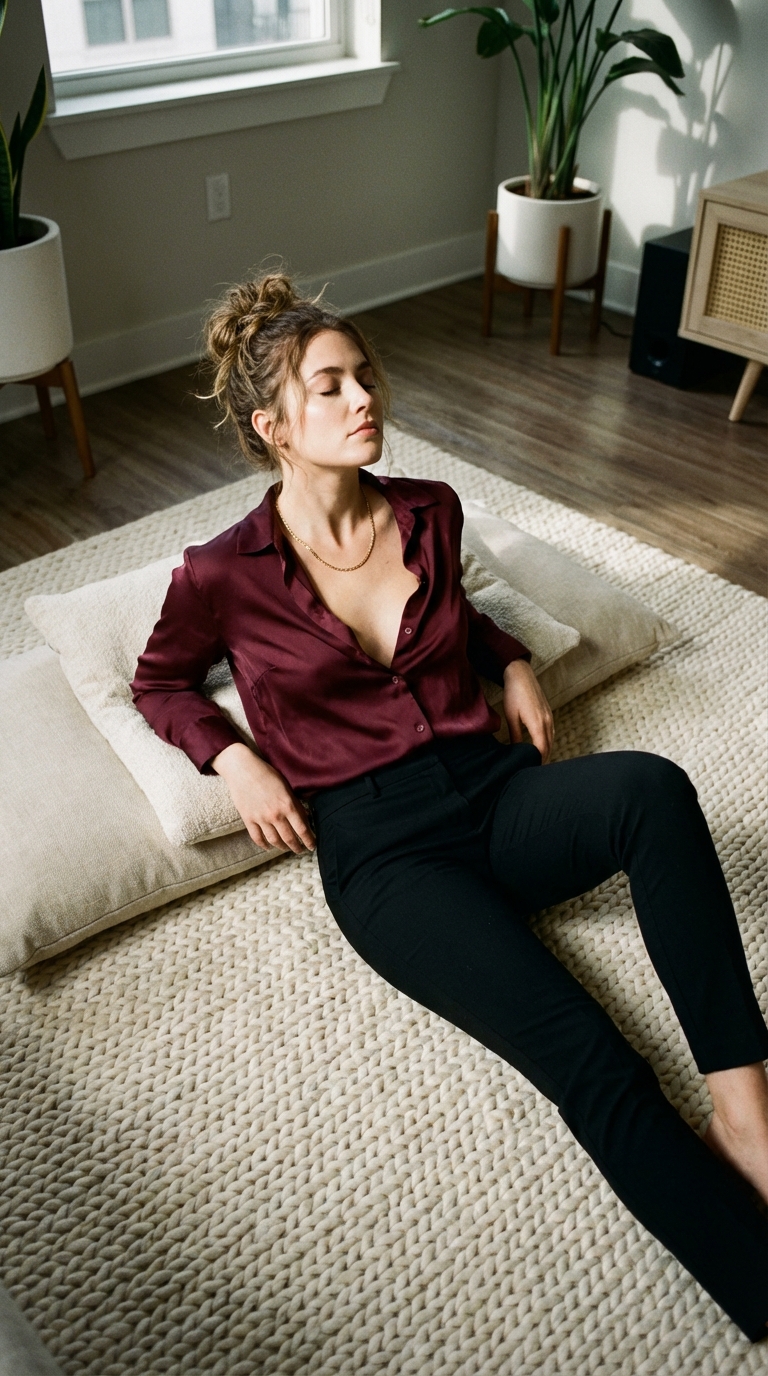 Velvet Dusk: Burgundy Silk Shirts & Flare Trousers | HeartIn